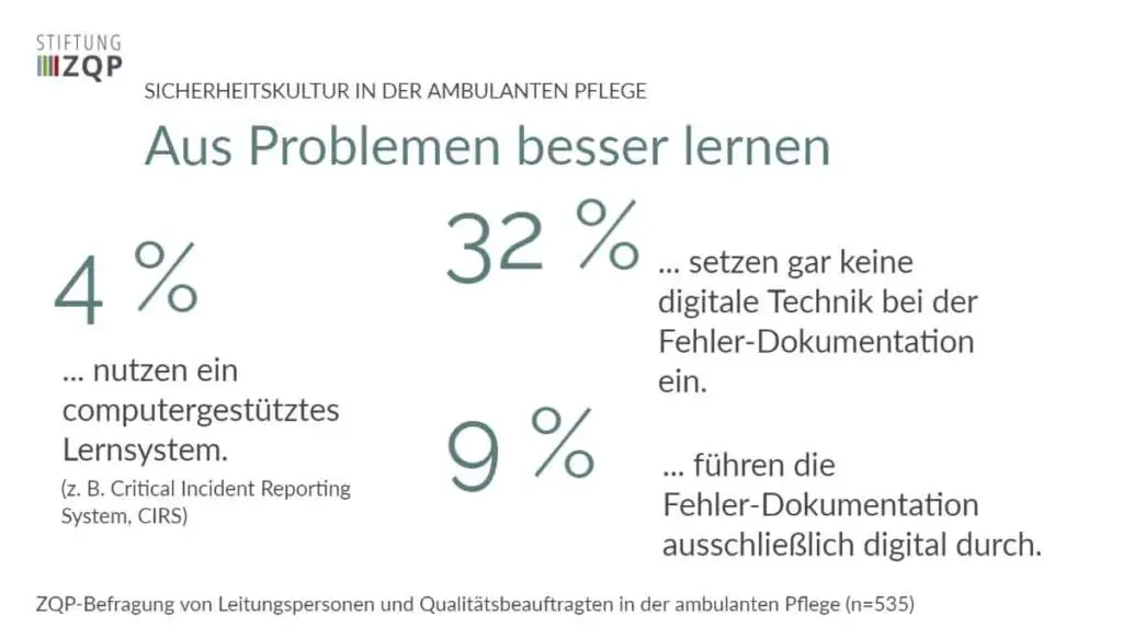 Ein wichtiges Ergebnis der Untersuchung ist, dass in der ambulanten Pflegepraxis bislang offenbar noch selten die Chancen der Digitalisierung genutzt werden, um aus unerwünschten Ereignissen und Pflegefehlern zu lernen und damit zukünftigen Problemen vorzubeugen.