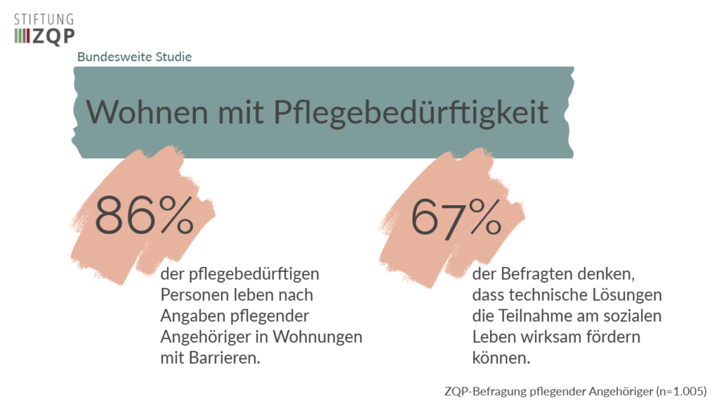 Die Studienergebnisse deuten darauf hin, dass die Wohnsituation pflegebedürftiger Menschen oft ungünstig ist. Über drei Viertel der befragten pflegenden Angehörigen berichten von Barrieren im privaten Wohnraum der pflegebedürftigen Personen. 39 Prozent sehen dort Sicherheitsrisiken bei Bad und WC. 40 Prozent meinen, die Fußwege im Umfeld seien für Menschen mit eingeschränkter Gehfähigkeit nur bedingt tauglich. Ein gutes Viertel sieht die Gehwege dort generell als eher unsicher an.
